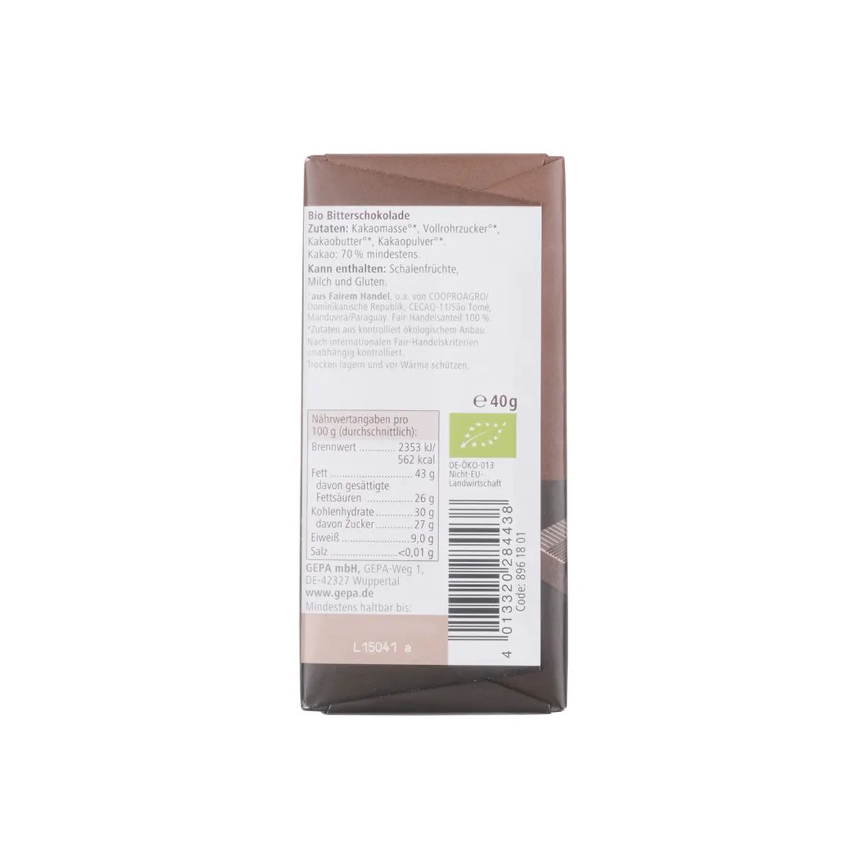 Kakaomasse°*, Mascobado-Vollrohrzucker°*, Kakaobutter°*, Kakaopulver°*. Kakao: 70% mindestens