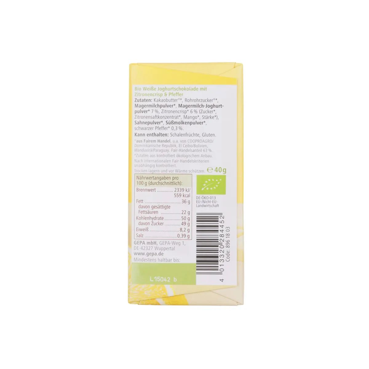 . weiße Jogurt-Schokolade mit Zitronencrisp und Pfeffer