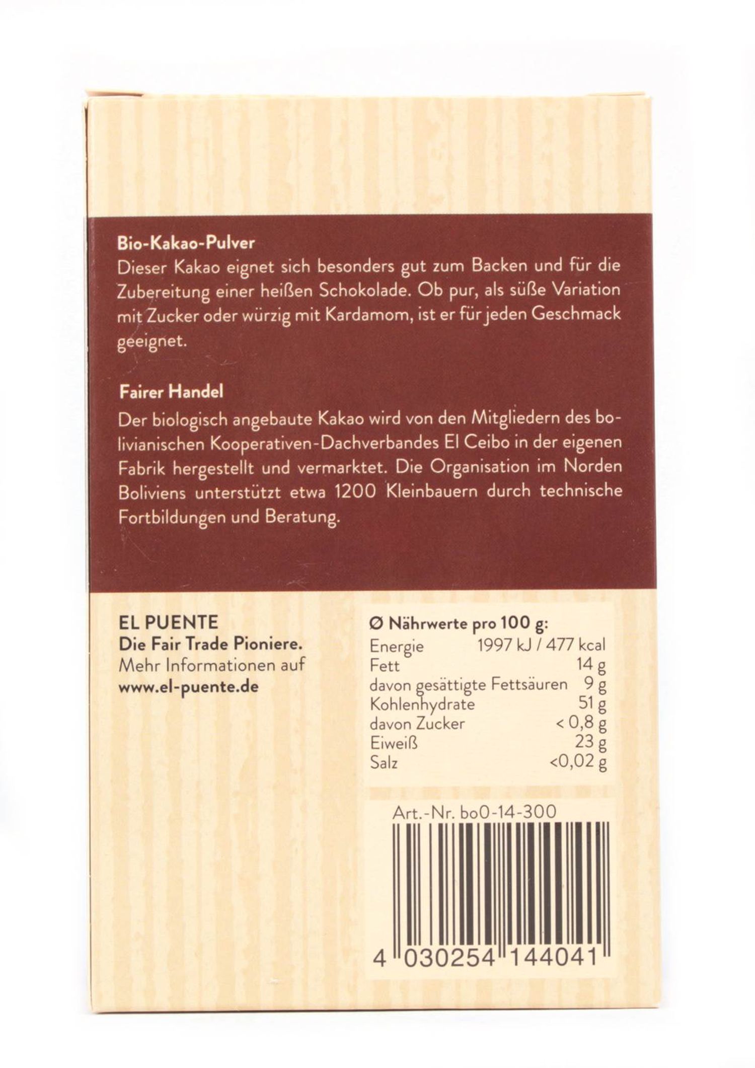 Dieses reine Bio-Kakao-Pulver wird von unserem Partner El Ceibo in Bolivien hergestellt. Die Kakaobohnen werden schonend geröstet und anschließend gepresst, um das Kakaopulver zu erhalten. El Ceibo verzichtet auf die Alkalisierung der Bohnen, ein Vorgang der sonst häufig vorgenommen wird, um dem Pulver eine dunklere Farbe zu verleihen. Da der Fettgehalt des fertigen Pulvers unter 20% liegt, gilt es als stark entöltes Kakaopulver. Es eignet sich gut für die Zubereitung von warmer Trinkschokolade und zum Backen.