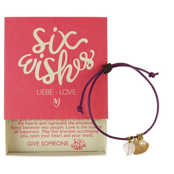 Armband aus lila farbenen Leder mit drei Charms (Perle, Herz und Rosenquarz), Umfang verstellbar. Thema: LIEBE