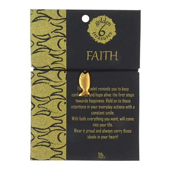 Faith – Vertrauen: "Dieses Armband soll dich daran erinnern, niemals die Zuversicht und Hoffnung zu verlieren. Mit Vertrauen wirst du all deine Ziele im Leben erreichen. Trage es mit Stolz und einem Lächeln im Herzen." Aus der Armbandreihe "6 Golden Treasures". Material: 24 Karat vergoldet/Legierung ca. 5 Mikron. Durchmesser ca.8mm. Schwarzes Textilarmband, Umfang variabel bis 20cm.