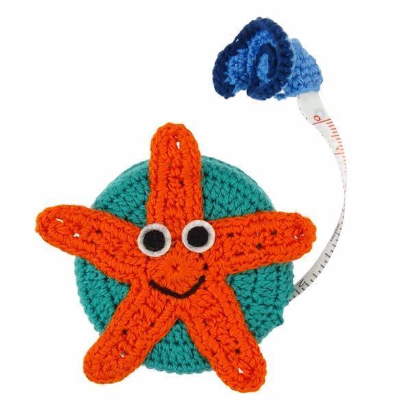 Durchmesser ca. 6 cm. Gehäkelter Seestern aus 100% Baumwolle mit einem Maßband im Bauch. Skala in cm und Inch, bis 145cm ausziehbar. An der Muschel rausziehen, zum Einrollen mit Daumen und Zeigefinger Mitte zusammendrücken. KEIN SPIELZEUG.