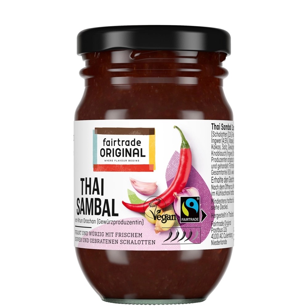 Rote Chilischoten (41,1%), gebratene Schalotten (Schalotten (10,6%), Reisöl), Rohrzucker, Schalotten (6,5%), Knoblauch (4,9%), Ingwer (4,5%), Wasser, Zitronengras, Reisöl, Säuerungsmittel: Essigsäure (E260), Kokos, Salz, Gewürzextrakt. Rote Chilischoten/Schalotten/Rohrzucker/Knoblauch/Ingwer/Zitronengras: nach Fairtrade-Standards gehandelt. Gesamtanteil 81%.