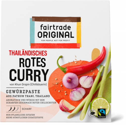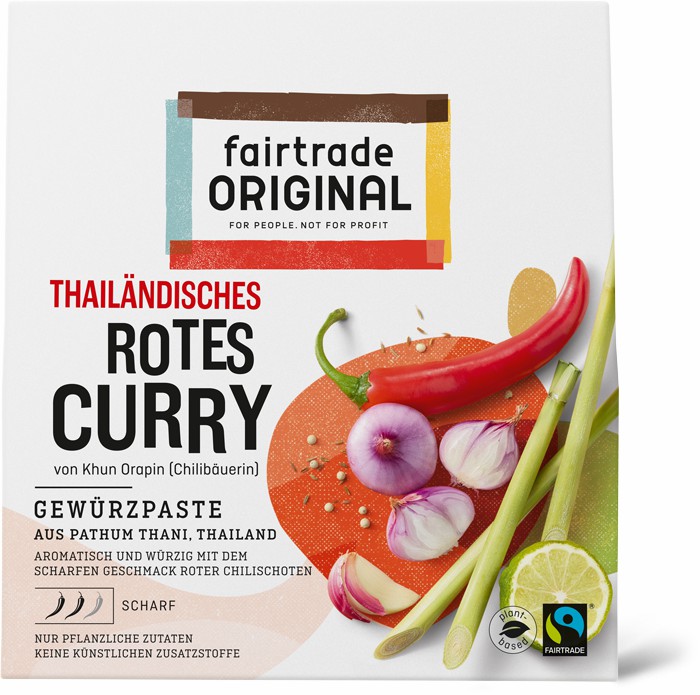 Reisöl, Wasser, Schalotten (12,7%), Knoblauch (11,4%), Zitronengras (10,4%), Galgant, Salz, rote Chilischoten (7,2%), Rohrzucker, Koriander, Kaffernlimette, Kümmel (0,5%), Pfeffer(0,3%). Schalotten/Knoblauch/Zitronengras/Galgant/rote Chilischoten/Rohrzucker: nach Fairtrade-Standards gehandelt. Gesamtanteil 64%. Rohrzucker mit Mengenausgleich.