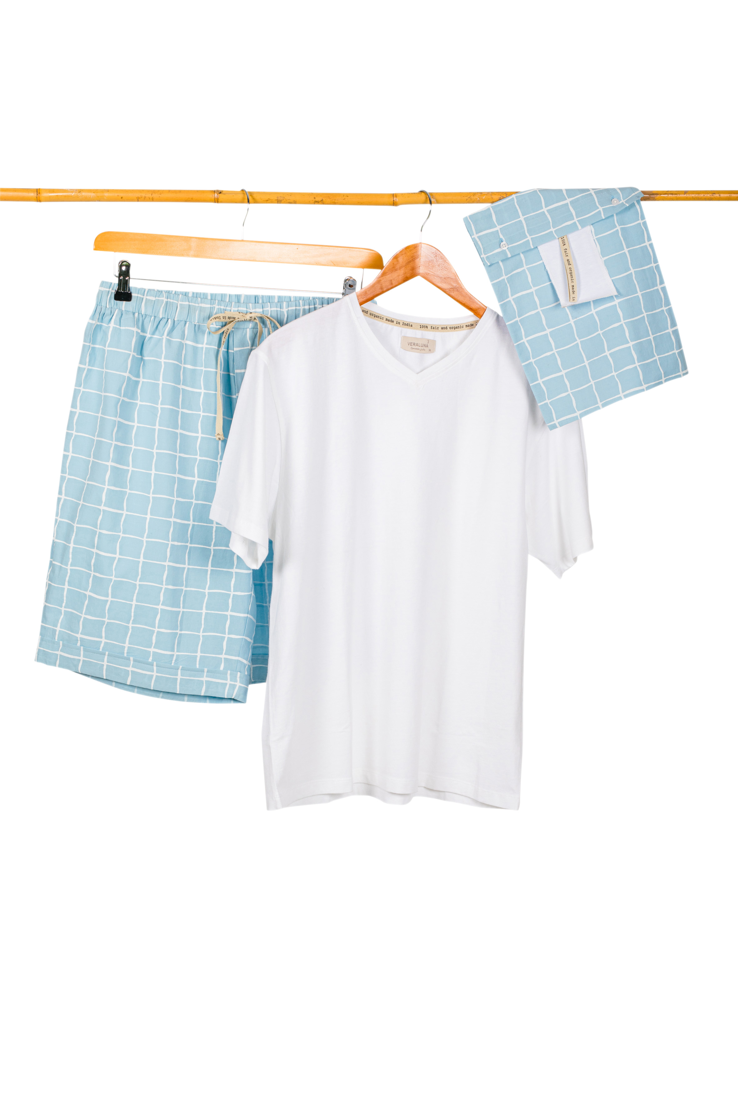 100% Bio-Baumwolle von unserem GOTS-zertifiziertem Handelspartner Rajlakshmi, verpackt im Geschenkbeutel aus Stoff im Streifen-Print der Pyjamahose, unifarbenes Langarmshirt mit V-Ausschnitt mit dezenter Verzierung, Hose aus fein gewebtem Stoff mit geradem Bein, dezente Verzierung am Hosenbund, stoffbezogener Gummibund, zusätzliches Zugband
