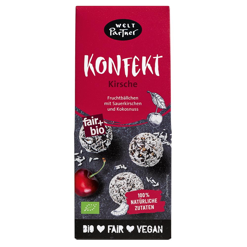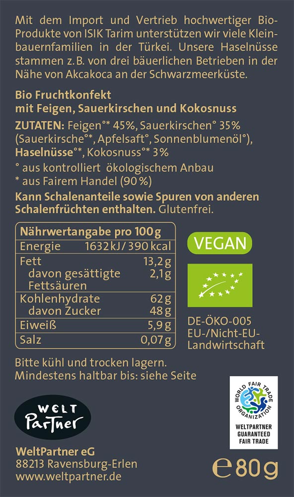 EAN: 4250941758140 Verpackungseinheit: 6 Stück Herkunft: Türkei Importeur/Lieferant: WeltPartner Empfohlener Verkaufspreis: € 4,29 brutto Öko-Kontrollstelle: DE-ÖKO-005 Herkunft: Nicht-EU-Landwirtschaft Artikel-Listen: Alle Artikel von WeltPartner  anzeigen.Zutaten: Produktzutaten:Feigen°*, Sauerkirschen°* (Sauerkirsche°*, Apfelsaft°, Sonnenblumenöl°), HASELNÜSSE°*, Kokosnuss°*
