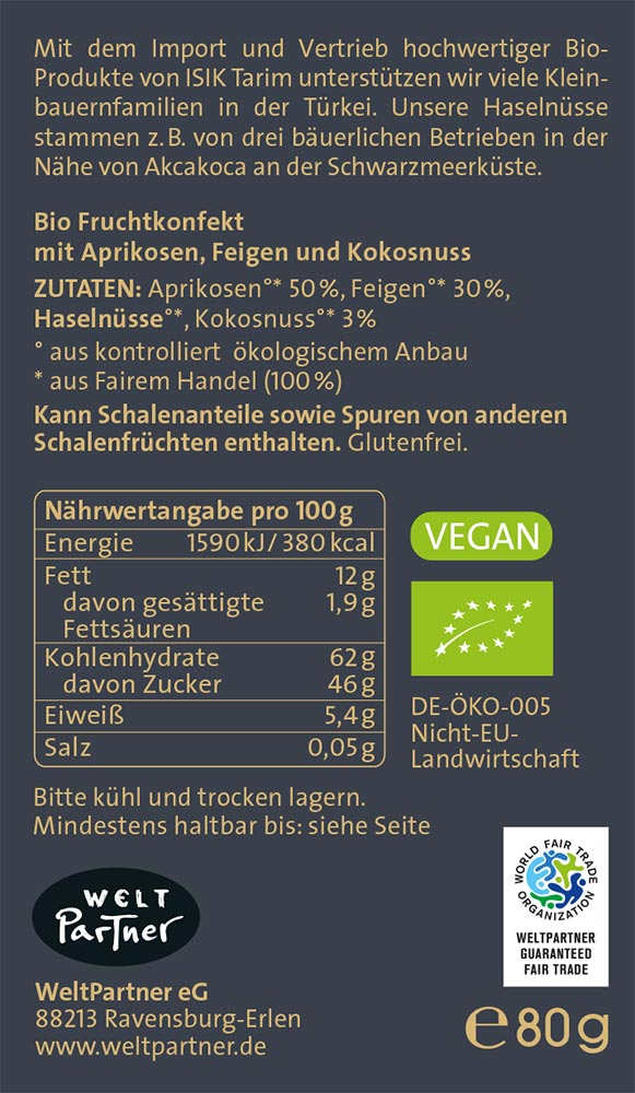 € 53,63 brutto / kg Öko-Kontrollstelle: DE-ÖKO-005 Herkunft: Nicht-EU-Landwirtschaft Artikel-Listen: Alle Artikel von WeltPartner  anzeigen.Zutaten: Feigen°*, Aprikosen°*, HASELNÜSSE°*, Kokosnuss°*