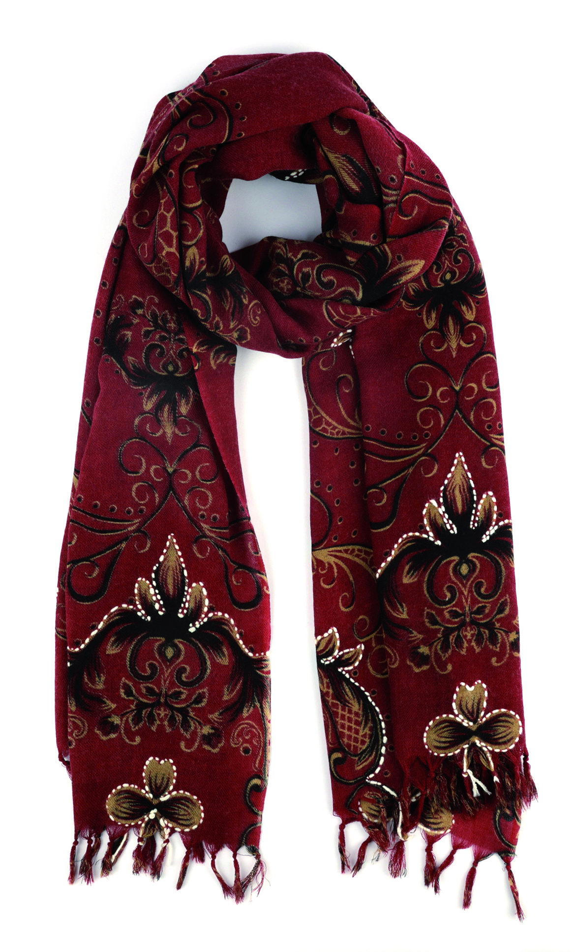 100% Merino-Wolle, handgewebt, -bedruck und -bestickt, 70 x 200 cm