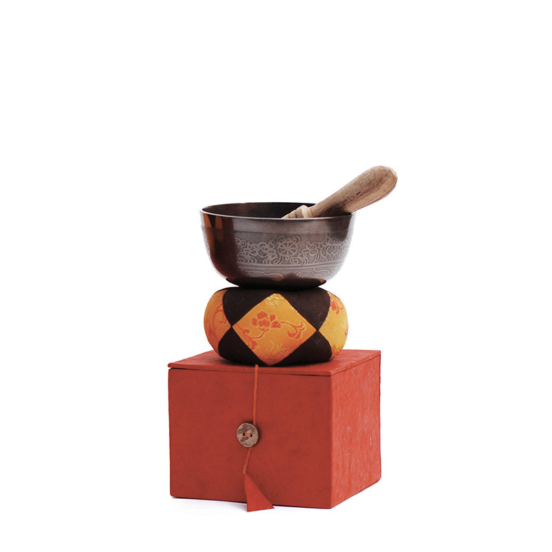 Geschenkset: Klangschale mit Gravur, Kissen und Klöppel in rotem Karton