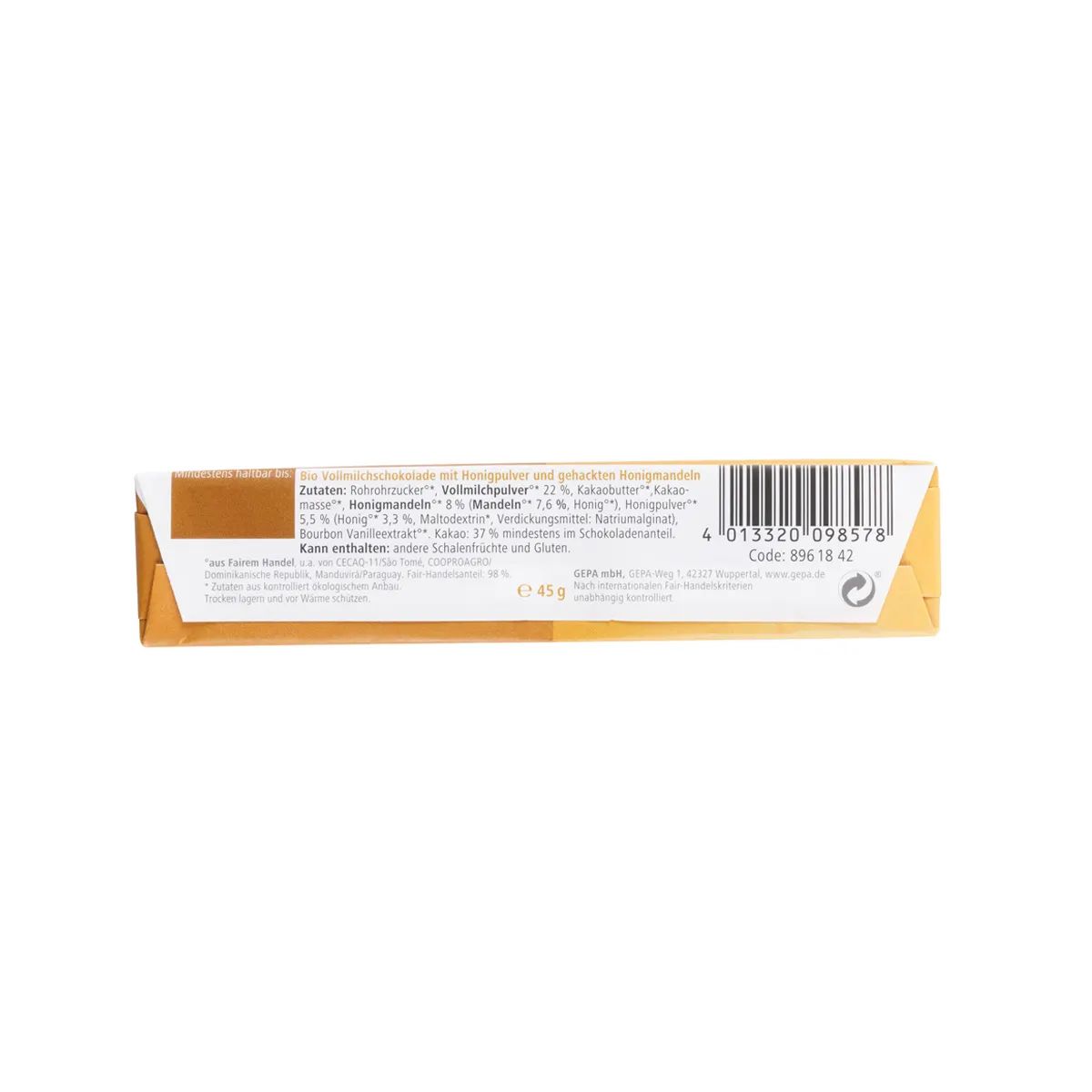 Bio Vollmilchschokolade mit Honigpulver und gehackten Mandeln