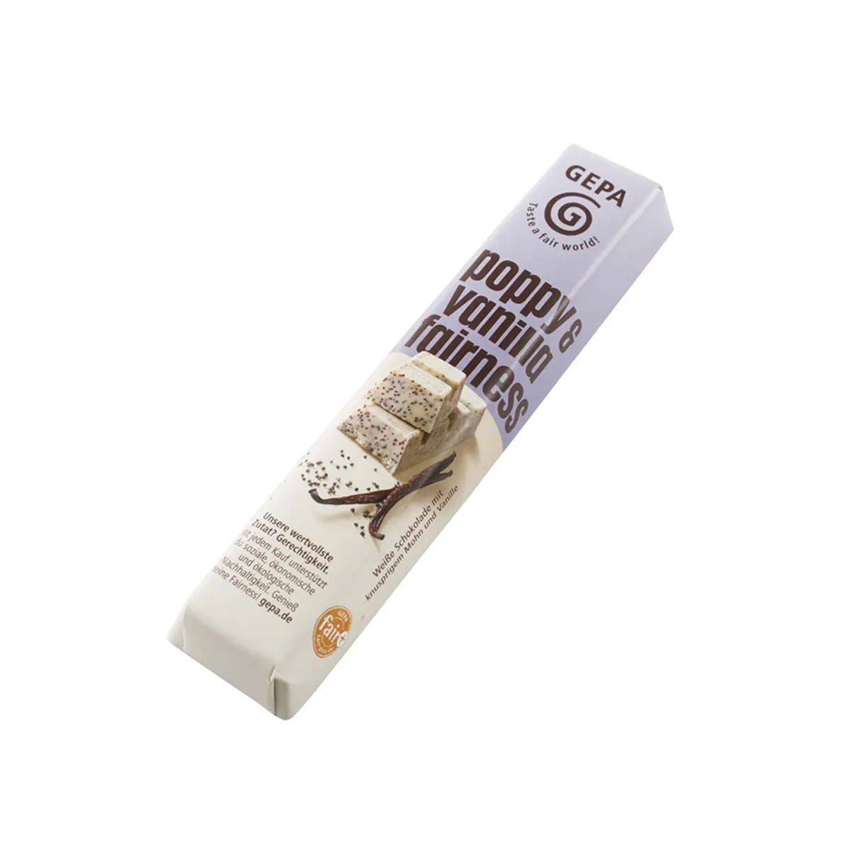 Genießen Sie aromatische weiße Schokolade mit knusprigen Mohnsamen und feinem Vanillegeschmack. Dieser köstliche Riegel überzeugt durch einen besonders zarten Schmelz, welcher durch schonendes und sorgfältiges Conchieren erreicht wird.