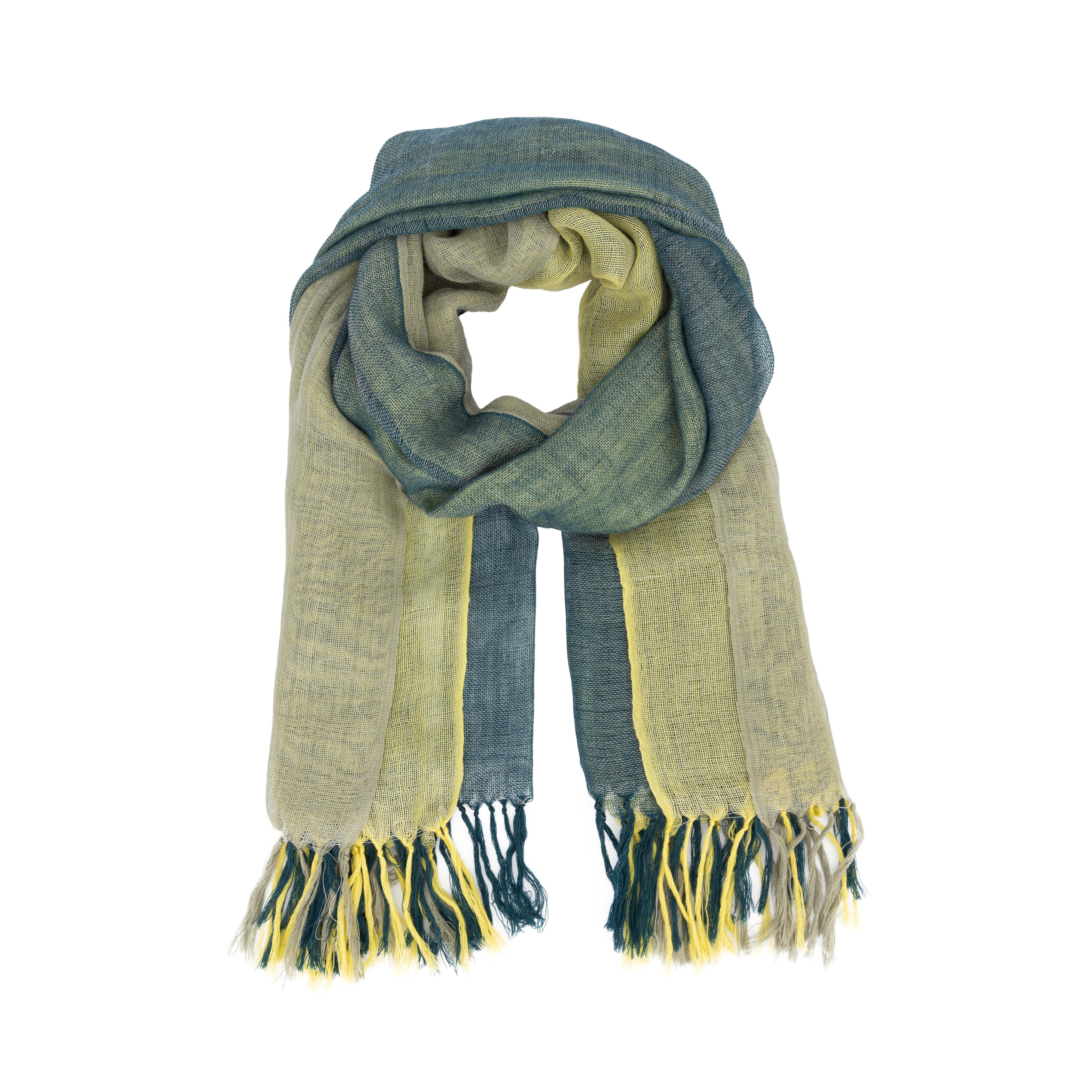 100% Merinowolle, handgewebt, blau/gelb/grün, 55 x 180 cm
