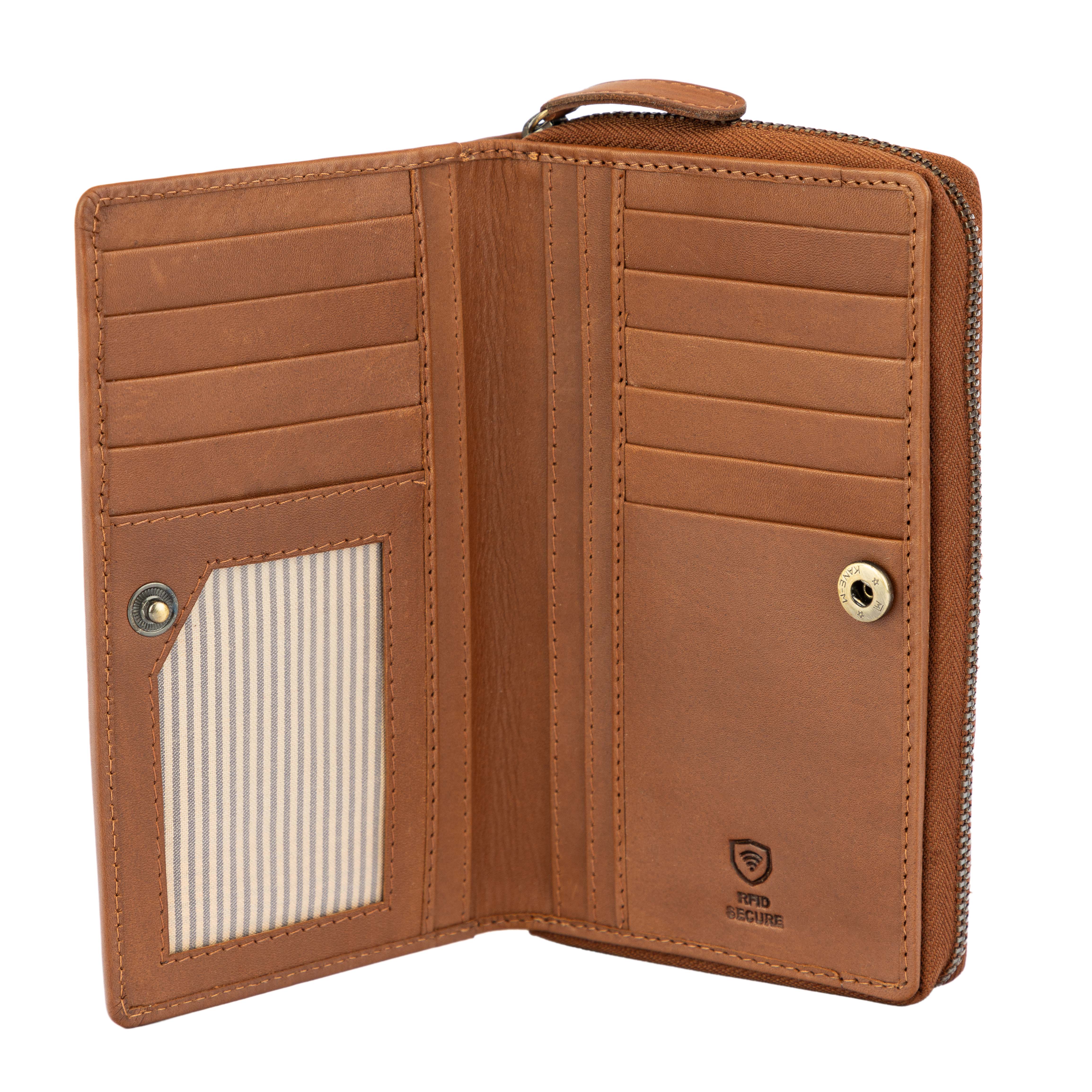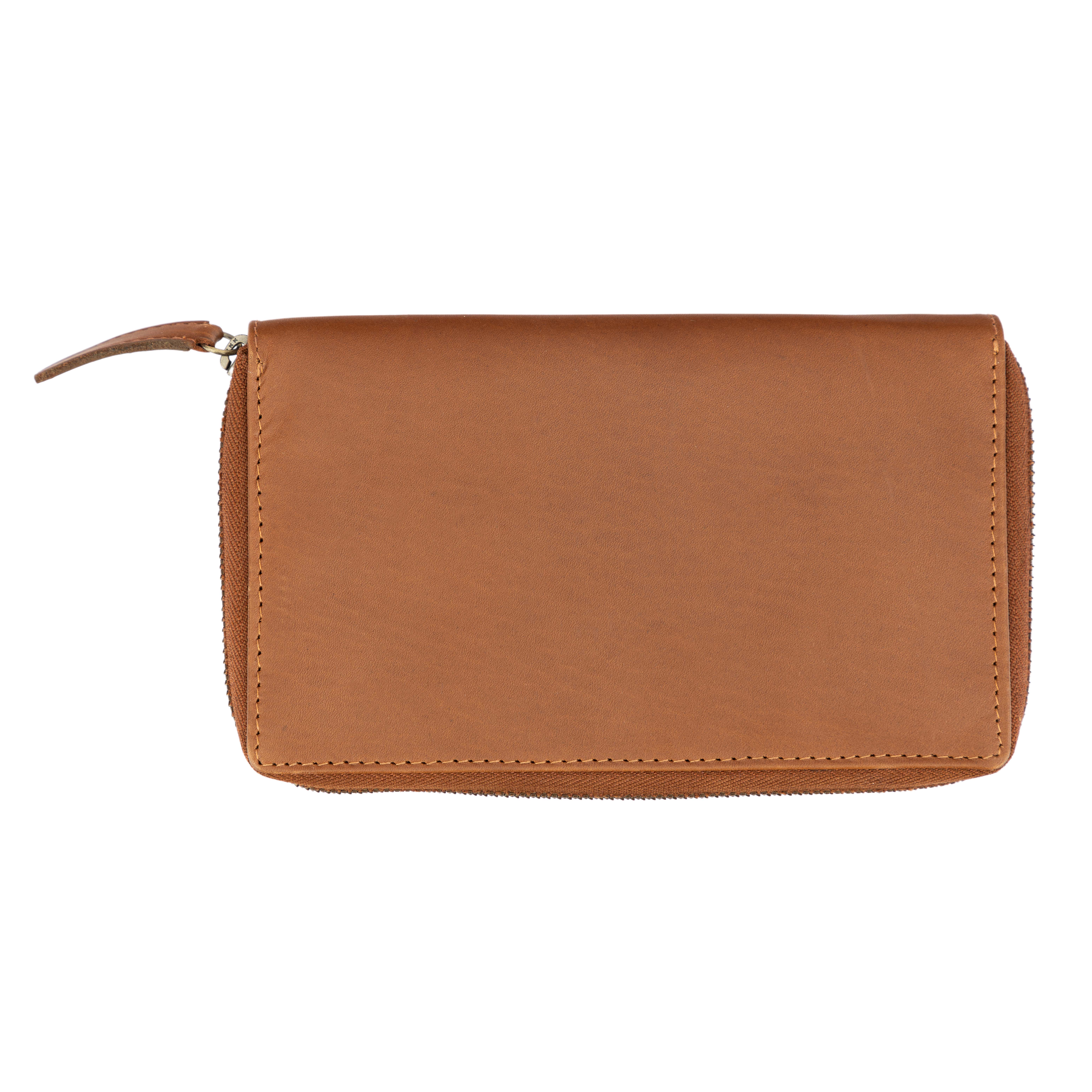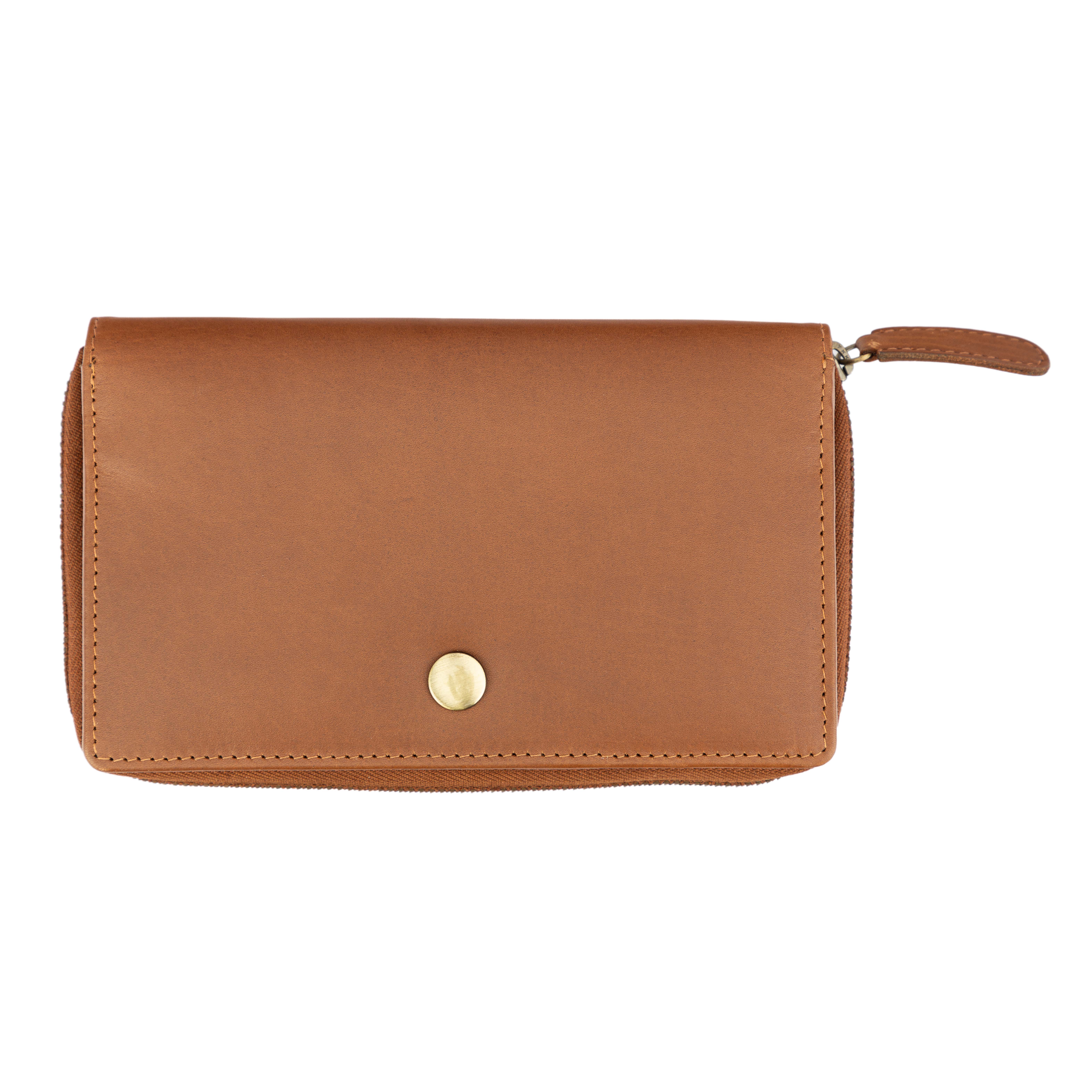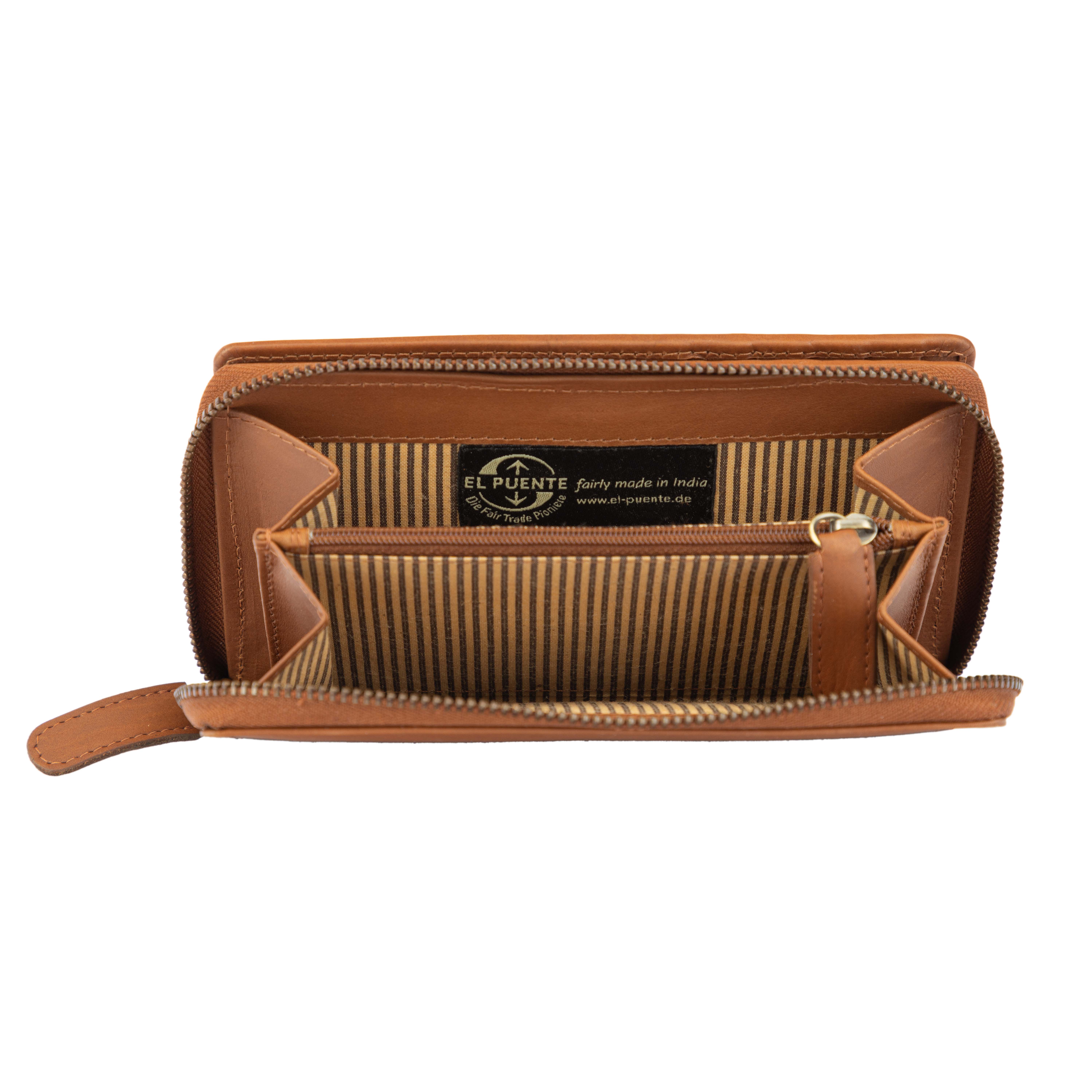 Rindsleder, Metall, Baumwolle, Kartenfach mit Druckknopf, Geldfach mit Reißverschluss, Auskleidung aus orange und braun gestreifter Baumwolle, braun, 16 x 10 x 3 cm