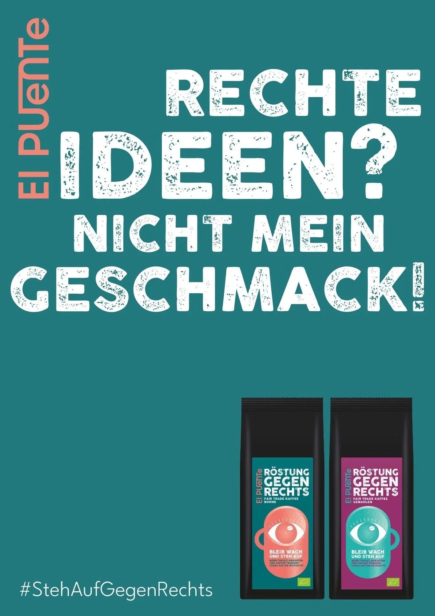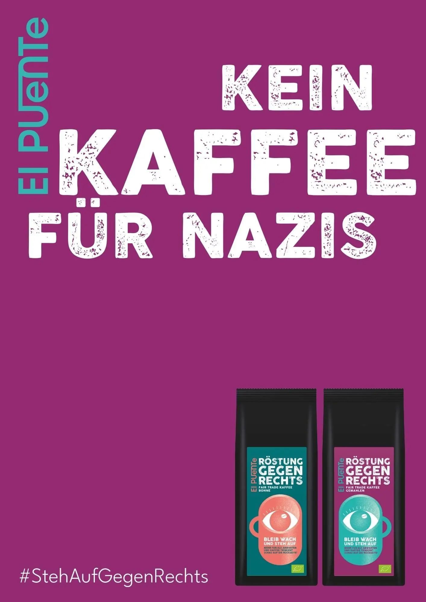 Beidseitig bedruckt: "Kein Kaffee für Nazis" & "Rechte Ideen? Nicht mein Geschmack!"
