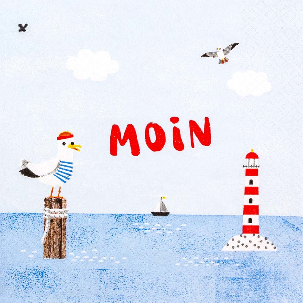 Hochwertige Motivservietten Moin 33x33 cm, 3-lagig mit besonders gutem Druck und FSC-zertifiziert. Hergestellt in Deutschland.
