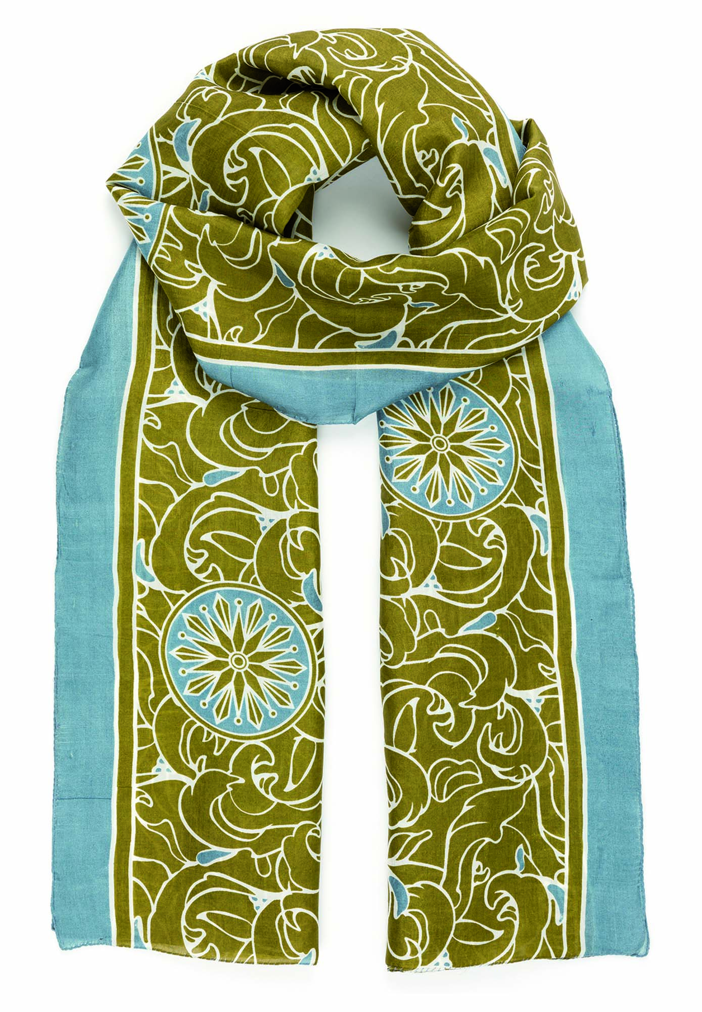 100% Seide, handgewebt und -bedruckt, grün/weiß/hellblau, 45 x 180 cm