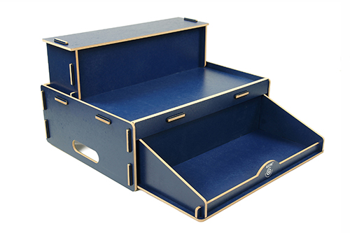 Jede Kiste besteht aus einem Fachteiler für Schoko, Riegel oder Snacks und ist fünf Kaffeepacks breit. Ein großer Kasten dient als stabil erhöhte Stellfläche. Aus Fachteiler, Kasten und einem Treppen-Element lassen sich leicht und schnell stufenförmige Kulissen zur Präsentation stellen. Alle drei Elemente sind außerdem so bemessen, dass sie für den Transport ineinander zu stellen sind. Die Ware hat in der Box ebenfalls Platz.